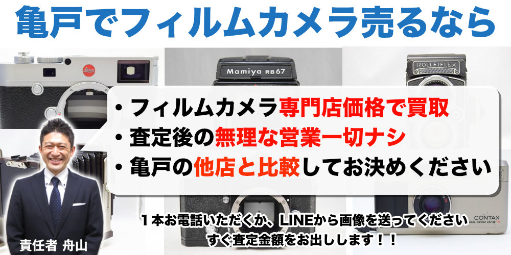 当店は古いフィルムカメラを中心に扱っております。亀戸駅周辺には10店舗前後の買取店ありますが、古いフィルムカメラなら一般的な買取店と比較したとき、魅力ある金額をご提案できる自身があります。